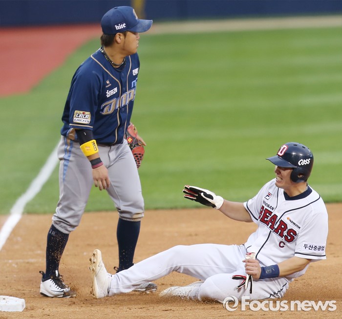 (서울=포커스뉴스) 28일 서울 잠실구장에서 열린 2016 프로야구 NC-두산 경기 4회말 무사 1루에서 두산 국해성의 중전 안타때 1루주자 김재호가 3루에서 세이프되고 있다.