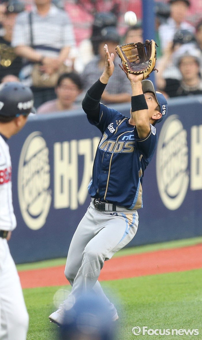 (서울=포커스뉴스) 28일 서울 잠실구장에서 열린 2016 프로야구 NC-두산 경기 3회말 NC 유격수 손시헌이 두산 오재원의 3루쪽 파울 플라이를 잡고 있다.