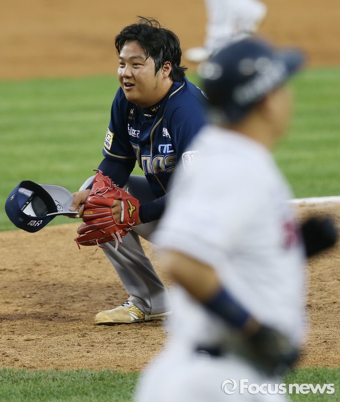 (서울=포커스뉴스) 28일 서울 잠실구장에서 열린 2016 프로야구 NC-두산 경기 4회말 무사 1,2루에서 NC 투수 이민호가 두산 양의지에게 볼넷을 내주고 마운드에 쭈그려 앉아 아쉬워하고 있다.