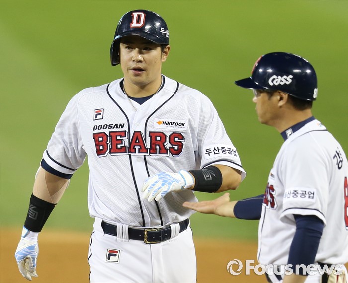 (서울=포커스뉴스) 28일 서울 잠실구장에서 열린 2016 프로야구 NC-두산 경기 5회말 1사 3루에서 두산 김재환이 우전 적시타를 치고 강동우 코치의 축하를 받고 있다.