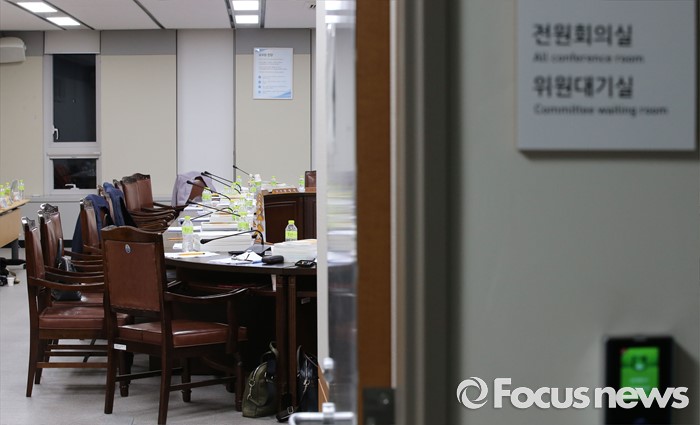 (세종=포커스뉴스) 최저임금 결정 법정 시한인 28일 저녁 세종시 정부세종청사 고용노동부 최저임금위원회 전원회의실에서 열린 전원회의 중 정회가 선언돼 위원들의 자리가 비어 있다.