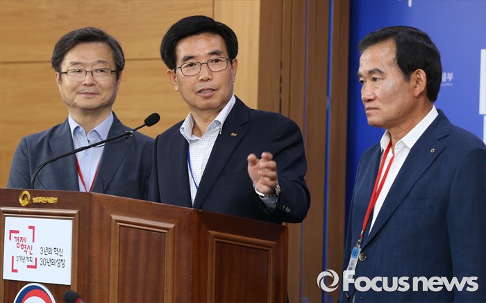 (세종=포커스뉴스) 이근성 낙농진흥회장이 28일 오후 세종시 농림축산식품부 기자실에서 2016년 원유기본가격을 전년보다 18원 인하한 리터당 922원으로 결정했다고 밝히고 있다. 왼쪽부터 박상도 한국유가공협회 전무, 이근성 낙농진흥회장, 신관우 충북낙농협동조합장.