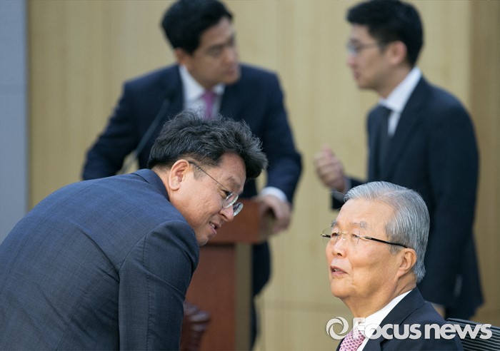 (서울=포커스뉴스) 29일 오전 서울 여의도 국회 의원회관에서 열린 아젠다 2050 창립총회에 참석한 김종인(오른쪽) 더불어민주당 비대위 대표와 이철의 의원이 대화하고 있다.