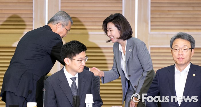 (서울=포커스뉴스) 29일 오전 서울 여의도 국회 의원회관에서 열린 아젠다 2050 창립총회에 참석한 나경원 새누리당 의원과 김종인 더불어민주당 비대위 대표가 인사하고 있다. 왼쪽부터 김 대표, 김세연 새누리당 의원, 나 의원, 김성식 국민의당 정책위의장.