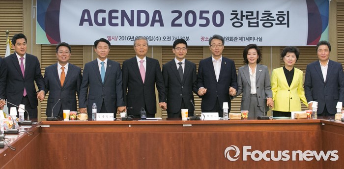 (서울=포커스뉴스) 29일 오전 서울 여의도 국회 의원회관에서 열린 아젠다 2050 창립총회에 참석한 의원들이 기념촬영을 하고 있다. 왼쪽부터 오신환 새누리당 의원, 이철희, 조정식 더불어민주당 의원, 김종인 비대위 대표, 김세연 새누리당 의원, 김성식 국민의당 정책위의장, 나경원, 박인숙, 이학재 새누리당 의원.
