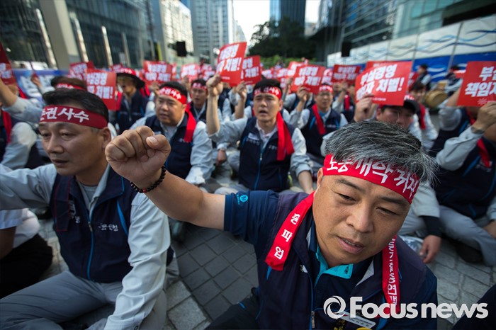 (서울=포커스뉴스) 29일 오전 서울 서초구 삼성 사옥 앞에서 삼성중공업 노동협의회 관계자들이 구조조정에 반대하는 시위를 하고 있다. 삼성중공업은 지난 15일 임원들의 임금 반납, 희망퇴직 등이 포함된 구조조정안을 공개했으며 올해 약 1500명 규모의 희망퇴직을 단행할 계획이라 밝혔다.