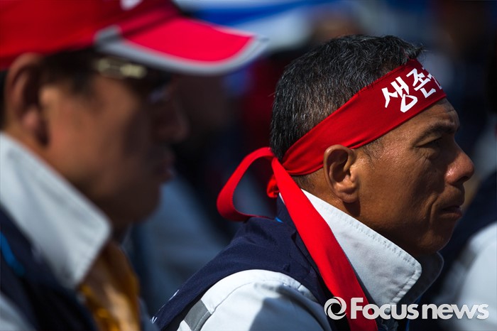 (서울=포커스뉴스) 29일 오전 서울 서초구 삼성 사옥 앞에서 삼성중공업 노동협의회 관계자들이 구조조정에 반대하는 시위를 하고 있다. 삼성중공업은 지난 15일 임원들의 임금 반납, 희망퇴직 등이 포함된 구조조정안을 공개했으며 올해 약 1500명 규모의 희망퇴직을 단행할 계획이라 밝혔다.