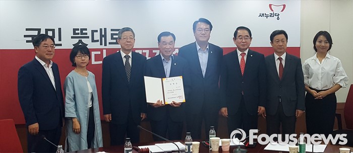 (서울=포커스뉴스) 김희옥(왼쪽 세번째) 새누리당 혁신비대위원장과 정진석(왼쪽 다섯번째) 원내대표, 박명재(오른쪽 세번째) 사무총장이 29일 오전 서울 여의도 당사에서 김기선(왼쪽 네번째) 신임 제1사무부총장에게 임명장을 수여한 뒤 기념촬영을 하고 있다.