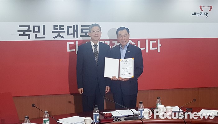 (서울=포커스뉴스) 김희옥(왼쪽) 새누리당 혁신비대위원장이 29일 오전 서울 여의도 당사에서 김기선 신임 제1사무부총장에게 임명장을 수여한 뒤 기념촬영을 하고 있다.