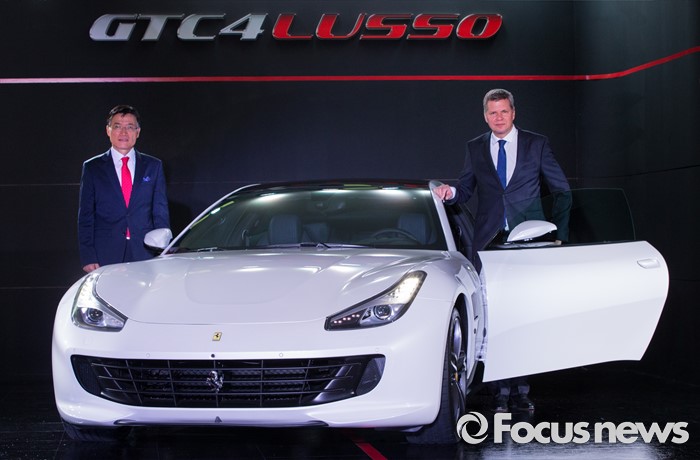 (서울=포커스뉴스) 29일 오전 서울 광진구 W서울 워커힐 호텔에서 열린 '페라리 GTC4 루쏘(GTC4Lusso)' 언론 포토세션 행사에 참석한 디터 넥텔페라리 극동 및 중동지역 CEO와 김광철 FMK 대표이사가 신차를 소개하고 있다.
