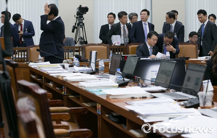 (서울=포커스뉴스) 29일 오전 서울 여의도 국회에서 열린 안전행정위원회 전체회의에서 더불어민주당 의원들의 퇴장으로 정회가 선포된 후 강신명 경찰청장이 관계자와 대화하고 있다.