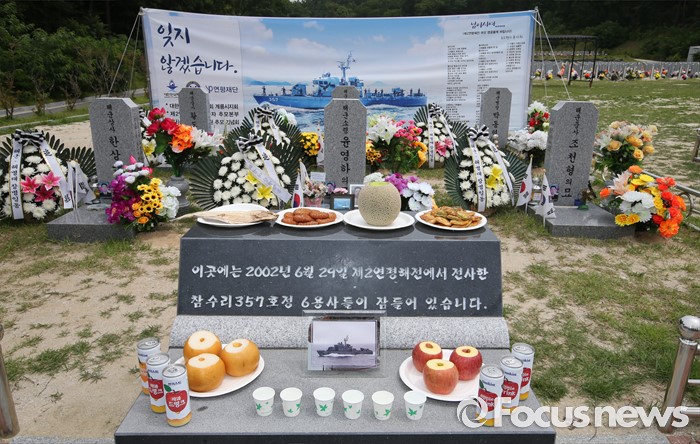 (대전=포커스뉴스) 제2연평해전 14주기를 맞은 29일 오전 대전 유성구 국립대전현충원 제2연평해전 전사자 묘역에서 인터넷 다음카페 제2연평해전 추모본부 정소영, 김수연 회원이 묘역에 차례상을 차려 놓았다.