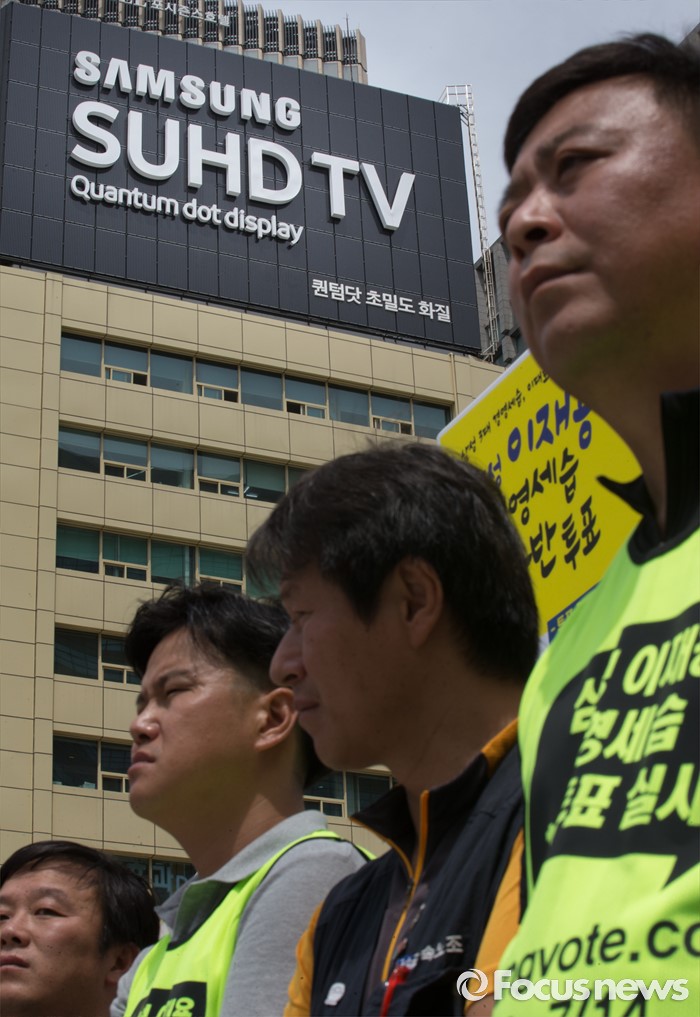 | △ 삼성전자 광고판 아래 이재용 세습 찬반투표 기자회견 |