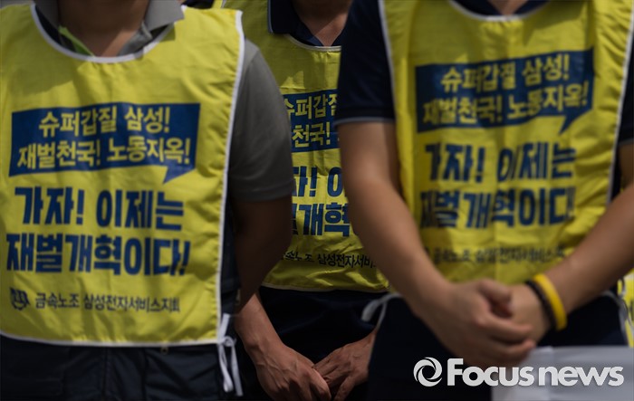 (서울=포커스뉴스) 29일 오전 서울 광화문광장에서 전국금속노동조합 삼성전자서비스지회와 반올림, 참여연대 등 시민단체들이 '삼성 이재용 3대 세습, 이대로 괜찮은가?' 찬반투표 선포 기자회견을 하고 있다.
