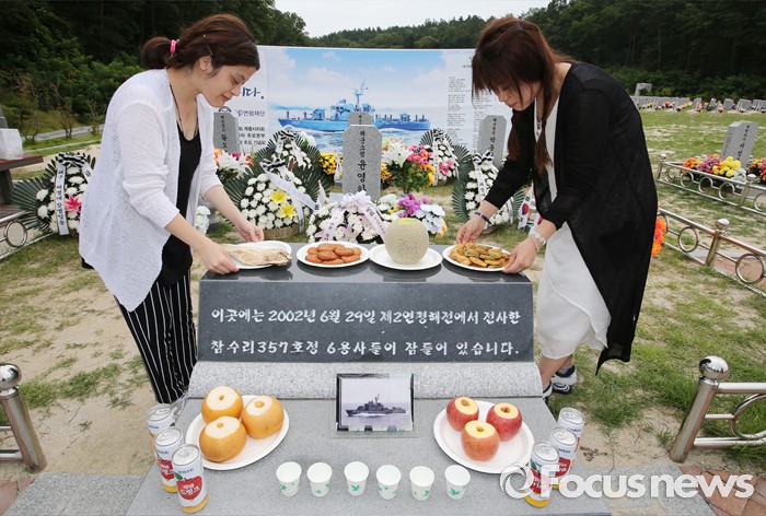(대전=포커스뉴스) 제2연평해전 14주기를 맞은 29일 오전 대전 유성구 국립대전현충원 제2연평해전 전사자 묘역에서 인터넷 다음카페 제2연평해전 추모본부 정소영(오른쪽), 김수연 회원이 묘역에 차례상을 차려 놓고 있다.