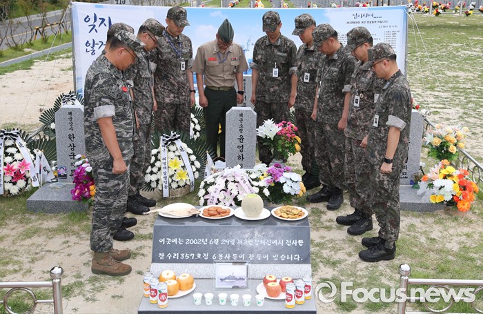 (대전=포커스뉴스) 제2연평해전 14주기를 맞은 29일 오전 대전 유성구 국립대전현충원 제2연평해전 전사자 묘역에서 故 윤영하 소령의 해군사관학교 50기 동기생들이 추모하고 있다.