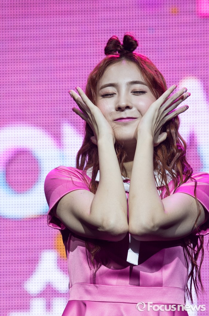 (서울=포커스뉴스) 29일 오전 서울 마포구 예스24 무브홀에서 열린 걸그룹 소나무의 미니앨범 '넘나 좋은 것' 쇼케이스에 참여한 멤버 나현이 포토타임을 갖고 있다.