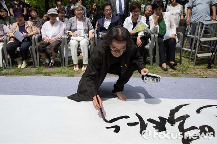 (서울=포커스뉴스) 29일 오전 서울 중구 예장동 옛 통감관저 터에서 열린 일본군 위안부 피해자 추모공원 '기억의 터' 기공식에 참석한 강병인 작가가 붓글씨 퍼포먼스를 하고 있다.