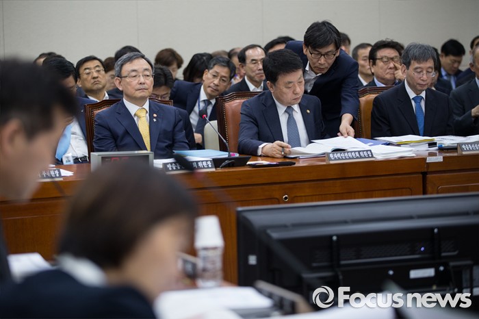 (서울=포커스뉴스) 최성준(왼쪽 첫번째) 방송통신위원장과 박효종(오른쪽 첫번째) 방송통신 심의위원회 위원장이 29일 오전 서울 여의도 국회에서 열린 미래창조과학방송통신위원회 전체회의에 출석하고 있다.