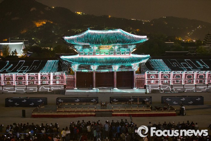 ☞미디어 파사드: 건축물 외벽을 가리키는 '파사드(Facade)'와 '미디어(Media)'의 합성어로, 건축물을 스크린으로 활용해 다양한 미디어 영상을 보여주는 기법(서울=포커스뉴스) 29일 저녁 서울 경복궁 흥례문 광장에서 열린 제 2회 궁중문화축전 개막제에서 경복궁의 역사를 빛으로 담아낸 '미디어 파사드' 공연이 시선을 사로잡고 있다. '오늘, 궁을 만나다'를 주제로 열리는 2016년 궁중문화축전은 다채로운 프로그램들과 함께 5월 8일까지 열린다. 2016.04.29 김흥구 기자