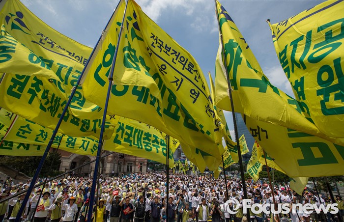 (서울=포커스뉴스) 29일 오후 서울 용산구 서울역 앞에서 보건의료노조의 총력투쟁 결의대회 집회가 열리고 있다.