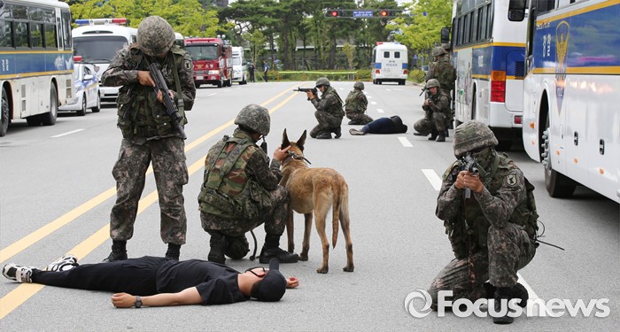 (세종=포커스뉴스) 29일 오후 세종시 정부세종청사경비대에서 열린 적 특수전부대원 침투 및 화학폭탄 폭발 대응 민·관·군·경 합동 민방위훈련에서 32시단 병력과 경력이 테러범을 소탕하고 있다.