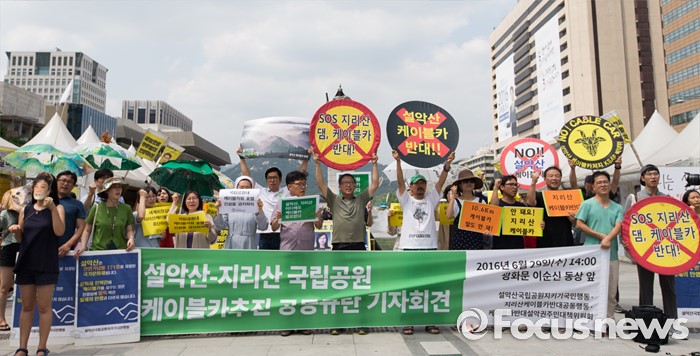 (서울=포커스뉴스) 설악산국립공원지키기국민행동 등 환경단체가 29일 오후 서울 광화문광장에서 설악산-지리산국립공원 케이블카추진 공동 규탄 기자회견 중 케이블카 사업 중단을 촉구하는 구호를 외치고 있다.