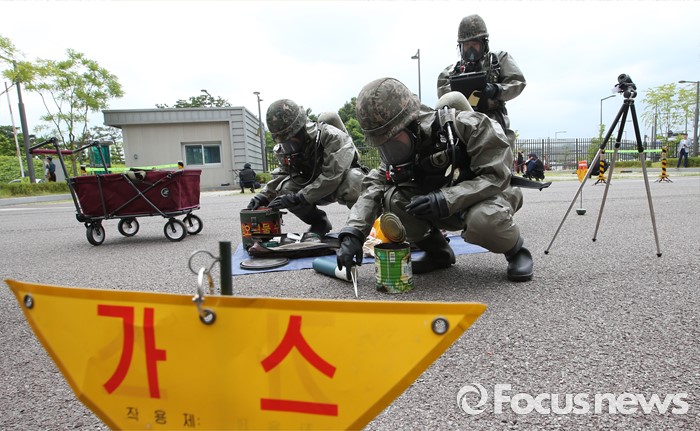 (세종=포커스뉴스) 29일 오후 세종시 정부세종청사경비대에서 열린 적 특수전부대원 침투 및 화학폭탄 폭발 대응 민·관·군·경 합동 민방위훈련에서 32시단 화학대대 병력들이 화학폭발물 수거를 하고 있다.