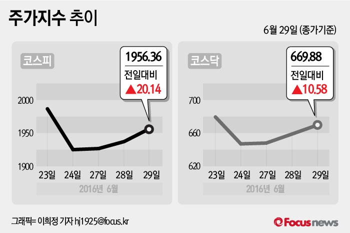 (서울=포커스뉴스) 29일 코스피지수는 전날보다 1.04%(20.14포인트) 오른 1956.36에 장을 마쳤다. 코스닥지수는 전일 대비 1.60%(10.58포인트) 오른 669.88에 마감했다.