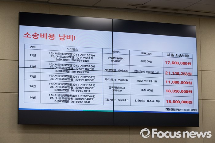 (서울=포커스뉴스) 29일 오후 서울 여의도 국회에서 열린 미래창조과학방송통신위원회 전체회의에서 이재정 더불어민주당 의원이 방송통신심의위원회에서 소송했던 소송비용 자료를 보여주고 있다.
