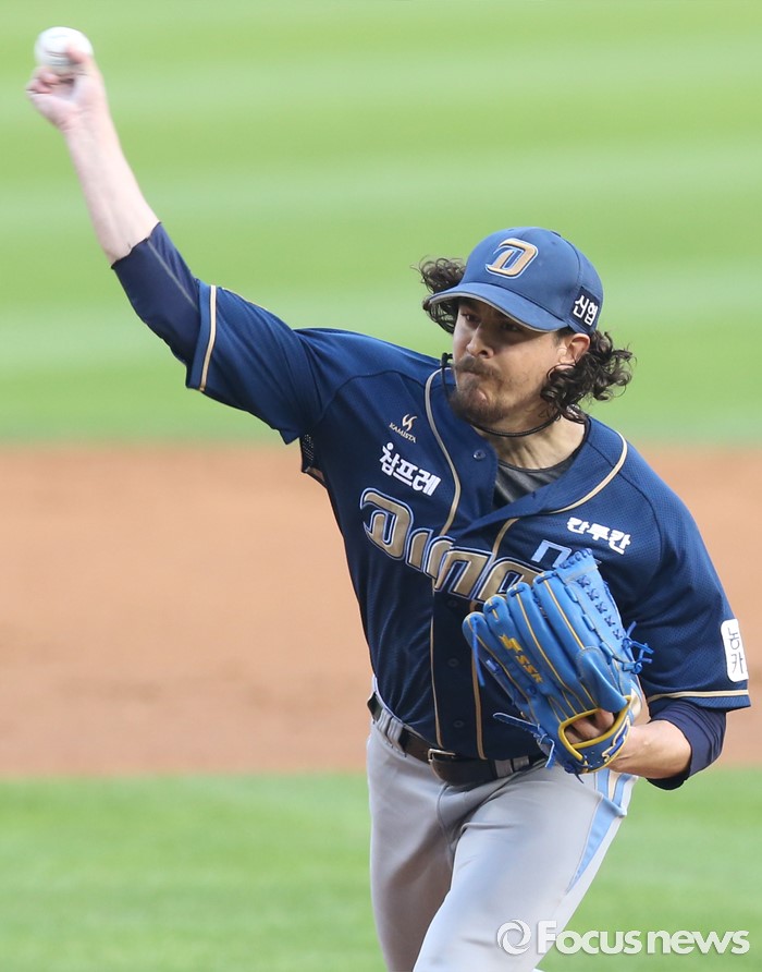 (서울=포커스뉴스) 29일 서울 잠실구장에서 열린 2016 프로야구 NC-두산 경기에서 1회말 NC 선발투수 스튜어트가 투구하고 있다.