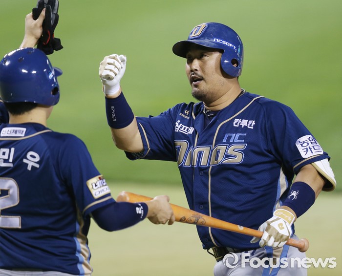 (서울=포커스뉴스) 29일 서울 잠실구장에서 열린 2016 프로야구 NC-두산 경기 6회초 1사후 NC 이호준이 중월 3점 홈런을 치고 선행주자 박민우의 환영을 받으며 홈인하고 있다.