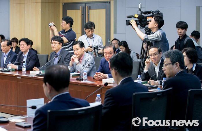 (서울=포커스뉴스) 30일 오전 서울 여의도 국회 의원회관에서 열린 국민의당 의원총회에 참석한 의원들이 박지원(가운데) 비대위원장의 모두발언을 듣고 있다.