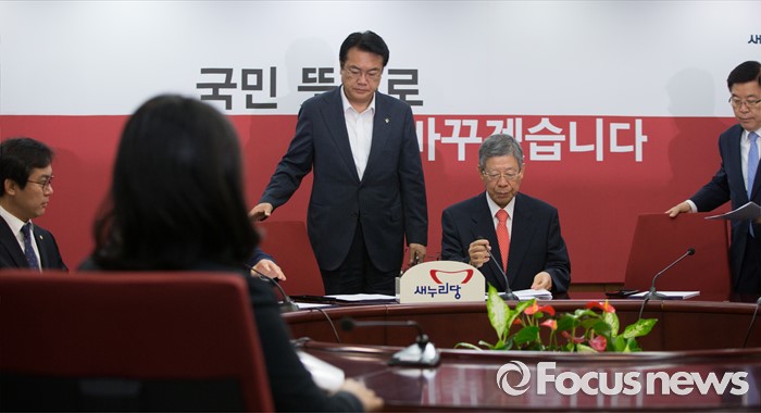 (서울=포커스뉴스) 정진석(오른쪽 세번째) 새누리당 원내대표가 30일 오전 서울 여의도 당사에서 열린 혁신비상대책위원회의에 참석하고 있다.
