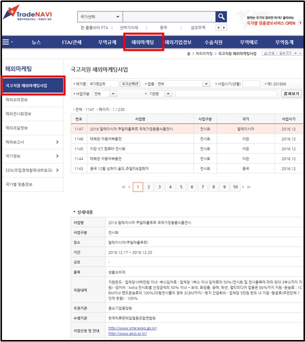 천진우 한국무역협회 정보지원실장은 "앞으로 우리 기업의 해외진출에 도움이 될 새로운 정보원을 계속 발굴해 데이터베이스화를 추진할 계획"이라고 말했다.'트레이드내비'의 국고지원 해외마케팅사업 검색 화면 <사진제공=한국무역협회>