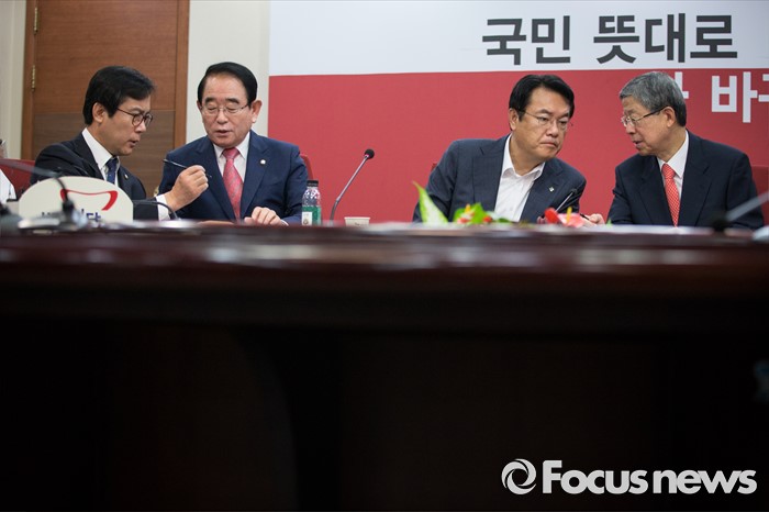(서울=포커스뉴스) 김희옥(오른쪽 첫번째) 새누리당 혁신비대위원장과 정진석 원내대표, 김영우(왼쪽 첫번째) 비대위원과 박명재 사무총장이 30일 오전 서울 여의도 당사에서 열린 혁신비상대책위원회의에서 각각 대화하고 있다.
