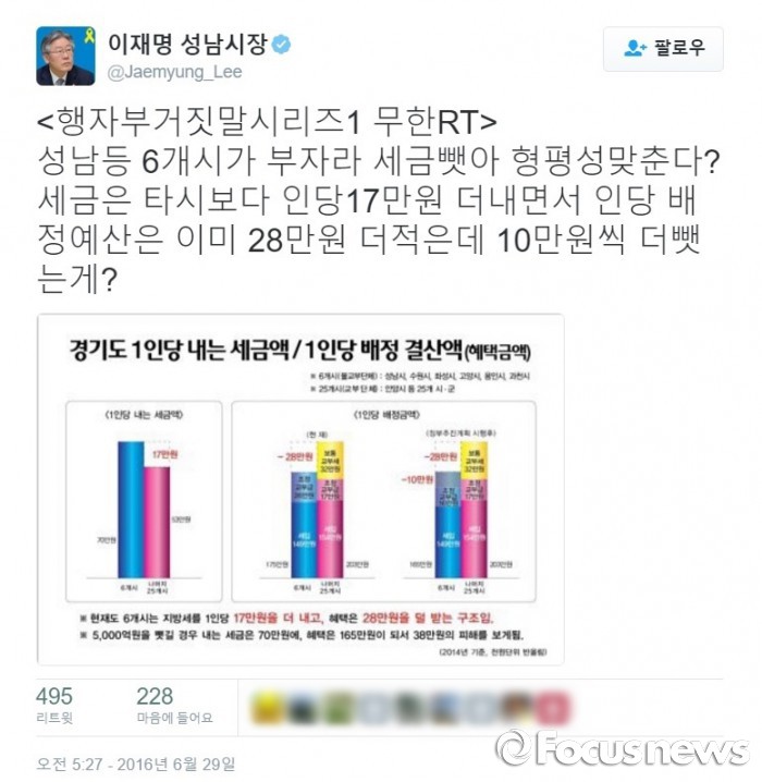이재명 시장은 트위터에서 "현재 경기도는 성남 등 6개 시가 다른 경기도내 시 보다 세금을 1인당 17만원 더 내면서 혜택은 28만원을 덜 받는 구조"라고 주장했다.