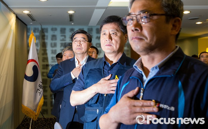 (서울=포커스뉴스) 30일 오전 서울 중구 프레스센터에서 열린 제45차 고용정책심의회에 참석한 이기권(왼쪽부터) 고용노동부 장관, 박대수 한국노총 부위원장, 김종인 민주노총 부위원장이 국민의례를 하고 있다.