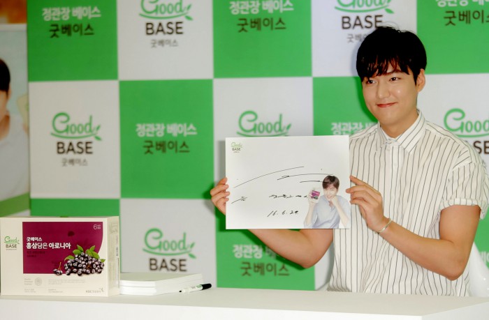 굿베이스는 KGC인삼공사의 자연소재 건강식품 브랜드로 정관장의 290여가지 안전성 검사를 거친 '홍삼 담은 아로니아' '자연이 키운 배' 등 다양한 건강식품을 판매하고 있다.KGC인삼공사 '굿베이스'의 모델 배우 이민호(29)씨가 29일 오후 서울 롯데백화점 잠실 에비뉴엘에서 팬사인회에 참석하고 있다. 2016.06.30 <사진제공=KGC인삼공사>