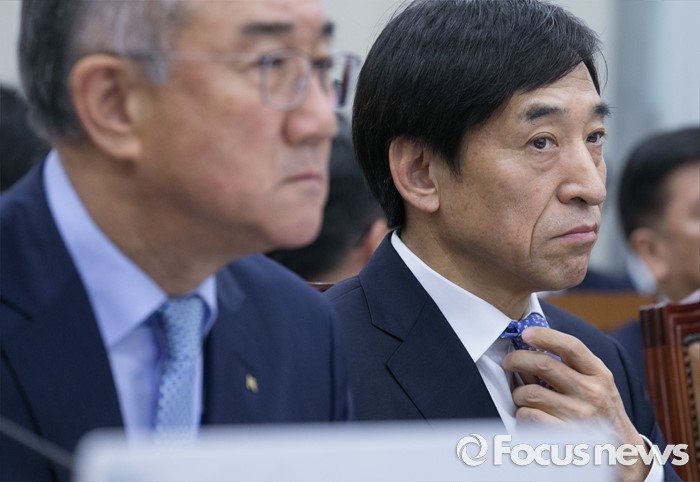 (서울=포커스뉴스) 30일 오전 서울 여의도 국회에서 열린 기획재정위원회 전체회의에 참석한 이주열 한국은행 총재가 넥타이를 만지고 있다. 왼쪽은 이덕훈 한국수출입은행장.