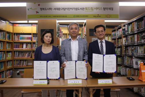 SK행복나눔재단은 30일 서울 서대문구립이진아기념도서관에서 김용갑 SK 행복나눔재단 사회적기업 본부장, 김순덕 행복도시락 서부플러스센터 대표, 변녹진 서대문구도시관리공단 이사장 등의 관계자가 참석한 가운데 북 드림 서비스 공동 개발·운영 업무협약(MOU)을 체결했다고 밝혔다.