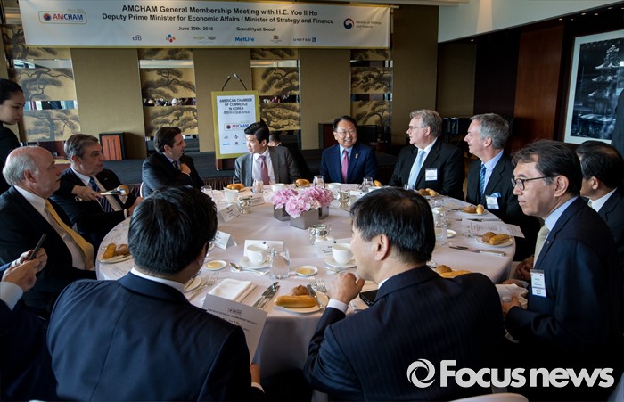 (서울=포커스뉴스) 유일호 경제부총리 겸 기획재정부 장관이 30일 오후 서울 용산구 그랜드하얏트 서울에서 열린 주한미국상공회의소 초청 오찬간담회에 참석해 암참 회원들과 대화하고 있다.