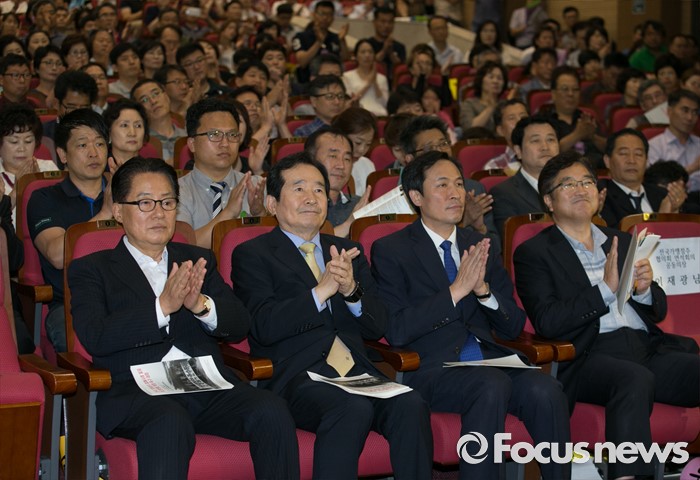 (서울=포커스뉴스) 30일 오후 서울 여의도 국회 의원회관에서 열린 전국가맹점주 피해사례 발표 및 관련법 개정촉구 대회에 참석한 박지원(앞줄 왼쪽부터) 국민의당 원내대표, 정세균 국회의장, 우상호 더불어민주당 원내대표, 우원식 을지로위원장 등 참석자들이 박수치고 있다.