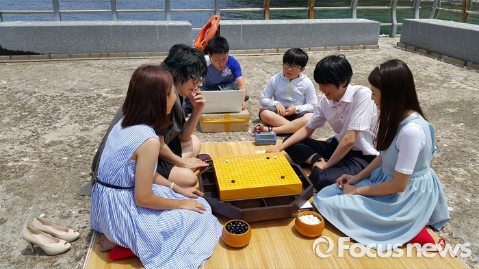 (서울=포커스뉴스) 30일 경북 울릉군 독도 선착장에서 이세돌 9단과 여류 바둑 캐스터인 장혜연이 한 팀, 가수 김장훈과 이슬아 4단이 상대편 팀으로 '독도나눔배 특별대국'을 하고 있다. 이날 대국은 이세돌 9단 팀이 202수 만에 불계승을 거뒀다. <사진제공=공연세상>