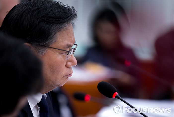 (서울=포커스뉴스) 30일 오후 서울 여의도 국회에서 열린 교육문화체육관광위원회 전체회의에 참석한 김호섭 동북아역사재단 이사장이 도종환 더불어민주당 의원의 질의를 듣고 있다.