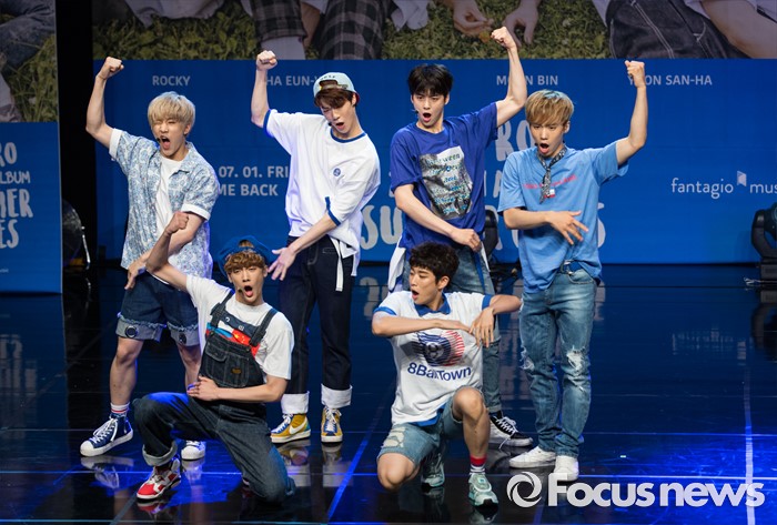 (서울=포커스뉴스) 30일 오후 서울 강남구 일지아트홀에서 열린 아이돌 그룹 아스트로의 두번째 미니앨범 'Summer Vibes' 발표 쇼케이스에 참여한 멤버들이 신곡무대를 선보이고 있다.