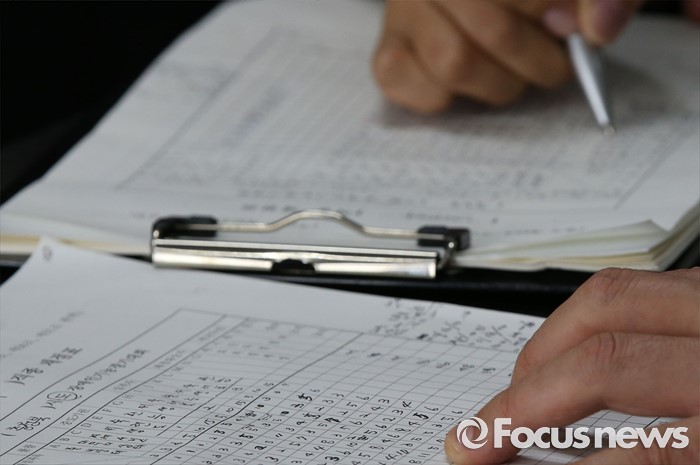 (청주=포커스뉴스) 30일 오후 충북 청주시 서원구 산남동 청주커피교육원에서 열린 충북 장애인기능경기대회 바리스타 종목 감독관이 경기가 끝나고 채점하고 있다.