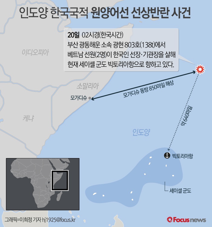 해경은 사건을 수사 중인 부산해양경비안전서로 이들을 이송한 뒤 살인 경위 등에 대해 조사할 예정이다.20일 해양수산부에 따르면 이날 오전 2시경(한국시간) 인도양 세이셀 군도 근처 해상을 운항하던 부산 광동해운 소속 138톤 원양어선(광현 803호)에서 베트남 선원 2명이 음주 후 난동을 부리는 등 한국 선장·기관장 사망사건이 발생했다. 현재 어선은 베트남 선원을 격리한 후 세이셸 빅토리아항 입항차 항해 중으로 3~4일 소요될 예정이다. 2016.06.20 이희정 기자