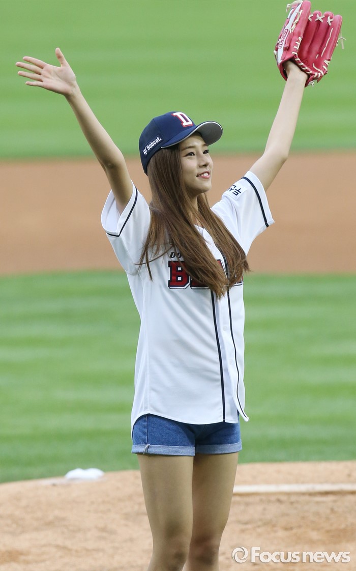 (서울=포커스뉴스) 30일 서울 잠실구장에서 열린 2016 프로야구 NC-두산 경기에 앞서 걸그룹 '라붐'의 솔빈이 시구를 마치고 팬들에게 인사하고 있다.