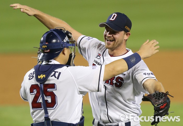 (서울=포커스뉴스) 30일 서울 잠실구장에서 열린 2016 프로야구 NC-두산 경기에서 두산 투수 보우덴이 9이닝 동안 139구를 던지며 KBO리그 역대 13번째 노히트노런을 달성하며 시즌 10승 고지에 올랐다. NC 마지막 타자 나성범을 삼진 아웃시키며 기록을 작성하고 포수 양의지와 포옹하고 있다.